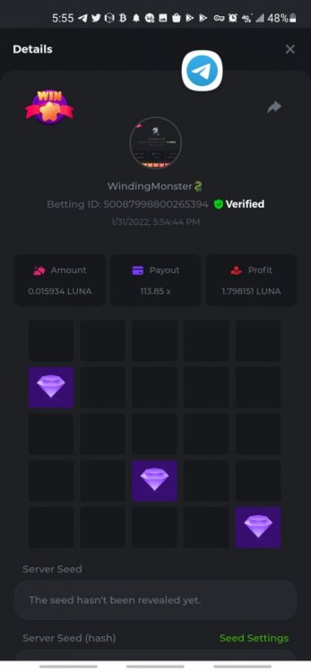 1. Betting ID: 50087998800265394 At the time of the bet, the price of Luna was apox. $52 usd.