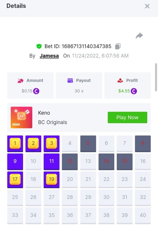 $2,500 Prestige Keno Multiplayer Challenge #56Jamesa replied to BCGame_Ewa's topic in Past Challenges Guess its hard hunting 17x classic already spent more thn 50$ and nvr hit it Ishdv bet on high risk instead. https://bc.game/#/sd/10XTCVFK5S6R6B https://bc.game/#/sd/10XTDF8YAIZHUB https://bc.game/#/sd/10XV83ZKVOVHN7