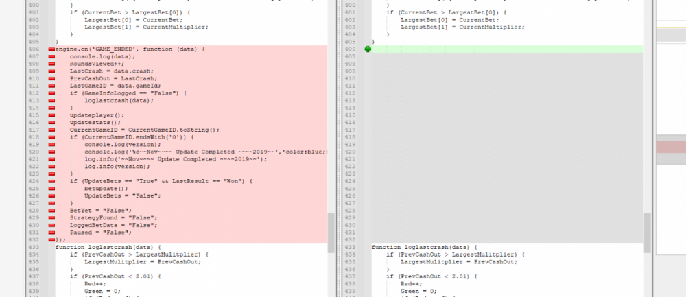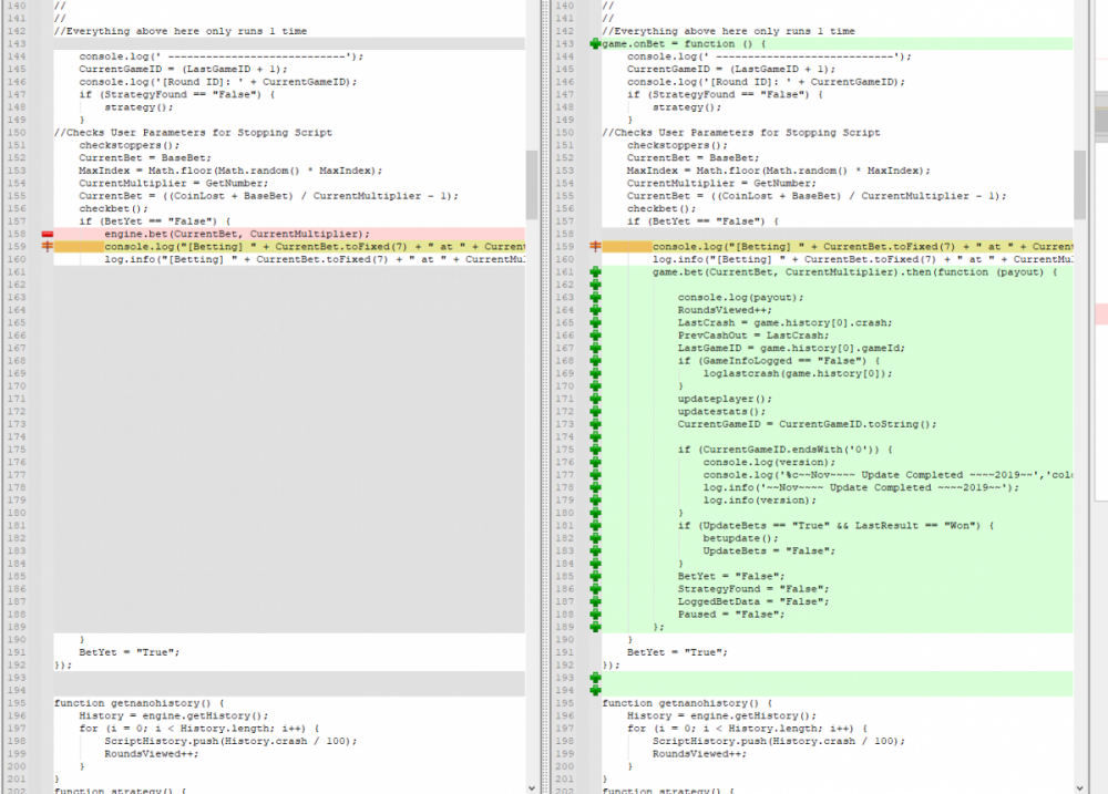 i can why don't you look at how i am doing in the script above it. Essentually they switched from using an event broadcast style to just having you declare a delegate. So here is a quick and dirty refactor of the two methods that were important. I left most everything as is. Things i am sure are going to break. The getting of the history. They not longer give you back more than 10 games and the script uses 200 to look for trends. It has some good concept but needs some refactoring for readability and maintainability, but i love things like using the random numbers for multipliers. I swear they are using machine learning for pattern recognition so that helps., I like the idea of limiting max bet to 10% of your bank roll. I don't play trendball so i can't really speak to the actual strategy at all because i don't know. Before i post the script with fixes so it uses the newer api and events that they still support here is a quick diff of the two scripts. The changes look like more than they actually are essentially all that happened was the game ended event's contents was moved to the then delegate of the onbet method. and i fixed some other minor things that would have throw exceptions like how to get the last games history since that has changed is isn't based back after the crash. Also just fair warning this method i don't believe is going to work because engine.getHistory() if it doesn't throw an exception it will just return null from what i have seen or you may get the last 10 games only along with a warning saying this method of accessing history is deprecated and you need to start saving your own historical results or something like that. ************************************************************************** Script Starting *********************************************************************************************** //******************* Nubs27's Smart Script for Crash ******************* // // // // If you find this script helpful please consider donating to Nubs27 or tipping on NanoGames.io: // Referral Link: https://n-luzqe.nanogames.io/ // // Donations accepted in many coin/token types. List & Addresses: // https://sites.google.com/view/nanogamescrashscripts/home/donation-addresses // // // var config = { mainTitle: { label: '*** Nubs27\'s Smart Script for Crash ***', type: 'title' }, auto: { label: '', value: 'Script', type: 'radio', options: [ { value: 'Script', label: 'Script chooses Base Bet'}, { value: 'Player', label: 'Player chooses Base Bet'} ]}, bet: { label: 'Base Bet', value: currency.minAmount, type: 'number' }, lossTitle: { label: 'Stop When ', type: 'title' }, stop: { label: 'Coins Lost >', value: 1, type: 'number' }, end: { label: 'Minutes >', value: 250, type: 'number' }, profit: { label: 'Profit >', value: 100, type: 'number' }, }; function main () { //PayOuts checked in the Stats Update const MultiplierArray = [2.5, 3.00, 5.00, 6.00, 7.00]; const LMultiplierArray = [10.00, 20.00, 50.00, 100.00]; var version = "v2.3"; var PayOutPercents = []; var PayOutConfidence = []; var Array2Filter = []; var FilteredArray = []; var ScriptHistory = []; var Trains = []; // Red Train IDs - finding gaps between & correlation between gap & duration var History = []; var RoundsPlayed = 0; var RoundsViewed = 0; var LastGameID = 1; var CurrentGameID = LastGameID + 1; var MinimumBet = currency.minAmount; var MaxBet = (currency.amount / 10); var TotalBets = 0; var CurrentMultiplier = MultiplierArray[1]; var LastMultiplier = MultiplierArray[1]; var MaxLossesEncountered = 3; var MostLost = 0; var LargestMulitplier = 2; var BaseBet = config.bet.value; var CurrentBet = BaseBet; var LastBet = BaseBet; var LastShrek = CurrentGameID; var LastTrain = 0; var Gap = 0; var AverageGap = 0; var LargestBet = [0,0]; var Enable100ID = 1000000; var LastResult = "Won"; var CoinLost = 0; var StopLossCoin = config.stop.value; var Losses = 0; var Wins = 0; var Red = 0; var Green = 0; var StartTime = new Date(); var EndTime = new Date(); var TimeDiff = (EndTime - StartTime); var StartBalance = currency.amount; var EndBalance = 0; var Profit = 0; var ATHProfit = 0; var ProfPerMin = 0; var NetProfit = 0; var DisplayGreeting = "False"; var GotHistory = "False"; var BetYet = "False"; var LoggedBetData = "False"; var GameInfoLogged = "False"; var StrategyFound = "False"; var IsPlaying = "False"; var UpdateBets = "False"; var Enable100 = "False"; var LastCrash = 0; var PrevCashOut = 0; var WonAmount = 0; var FindThisMultiplier = 1; var FindShouldHave = 2; var ThisAverage = 1; var HistorySlice = 50; var Paused = "True"; var IndexMax = PayOutConfidence[0]; var MaxIndex = 0; var GetNumber = 0; // Welcome the Player to the Script console.clear(); if (DisplayGreeting == "False") { log.info(' Nubs27s Smart Script for Crash'); log.info(" ****************"); log.info("See Web Console for more Information (Press F12)"); console.log('%c~~~~~~~~~~~~~~~~~ Nubs27\'s Smart Script for Crash ~~~~~~~~~~~~~~~~~','color:Purple; font-weight:bold'); console.log('%cScript Start Time: ' + StartTime,'color:Purple; font-weight:200'); console.log(' %cWelcome ' , 'color:Purple; font-weight:bold'); console.log(' %cYour Starting Balance is: ' + StartBalance + ' ' + currency.currencyName, 'color:Purple; font-weight:bold'); if (config.auto.value == 'Player') { if (config.stop.value > currency.amount) { MaxBet = (currency.amount / 10); config.stop.value = currency.amount * 0.98; console.log('%c[WARNING]: Stop Loss is above your Bankroll','color:Orange; font-weight:bold'); console.log('%c[WARNING]: Stop Loss Updated to ' + config.stop.value, 'color:Orange; font-weight:bold'); } if (config.bet.value > (config.stop.value / 15000)) { log.info('[WARNING]: Script Recommends a bankroll of at least ' + (BaseBet * 15000) + '' + currency.currencyName + ' for the Base Bet you provided'); log.info('[WARNING]: Script Recommends a bankroll of at least ' + (BaseBet * 20000) + '' + currency.currencyName + ' for the Base Bet you provided'); log.info('[WA