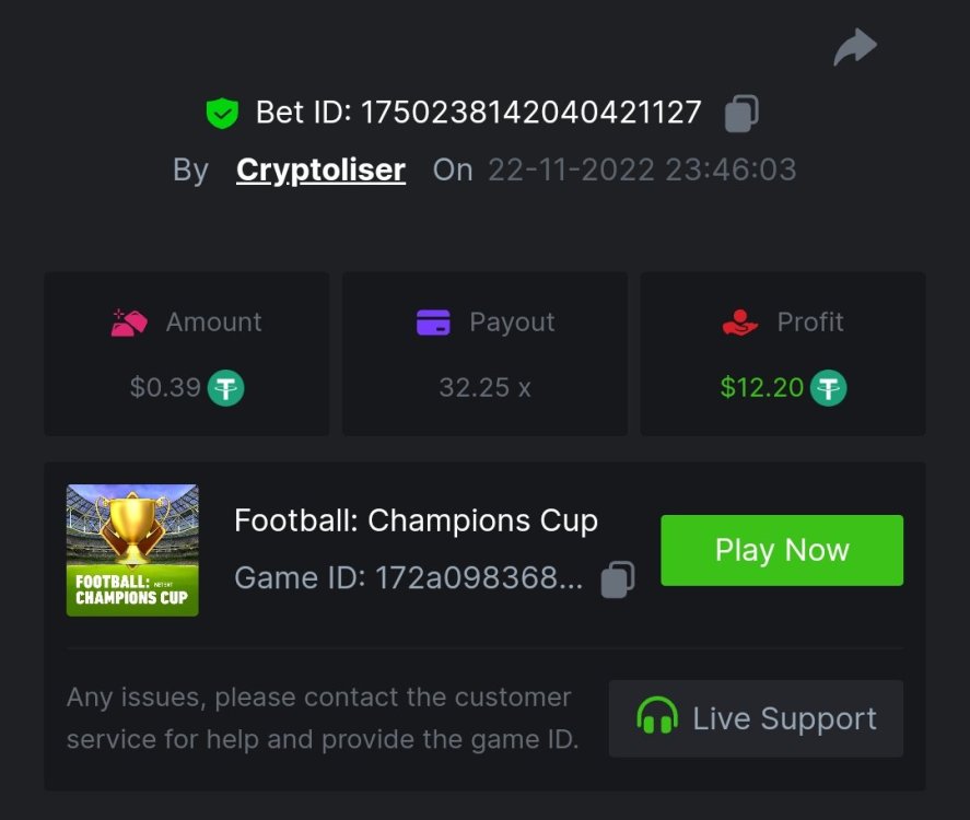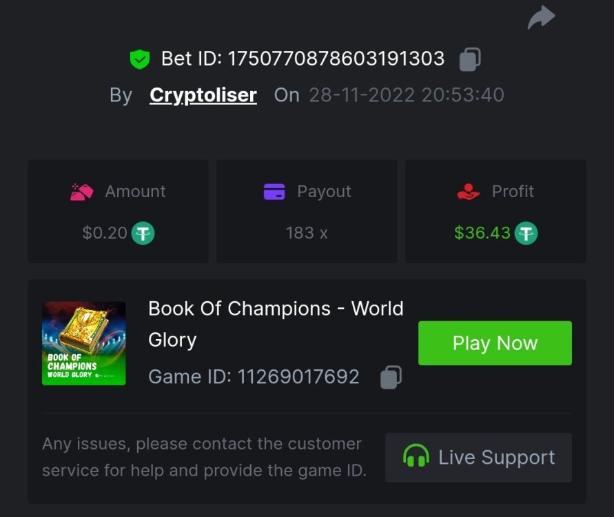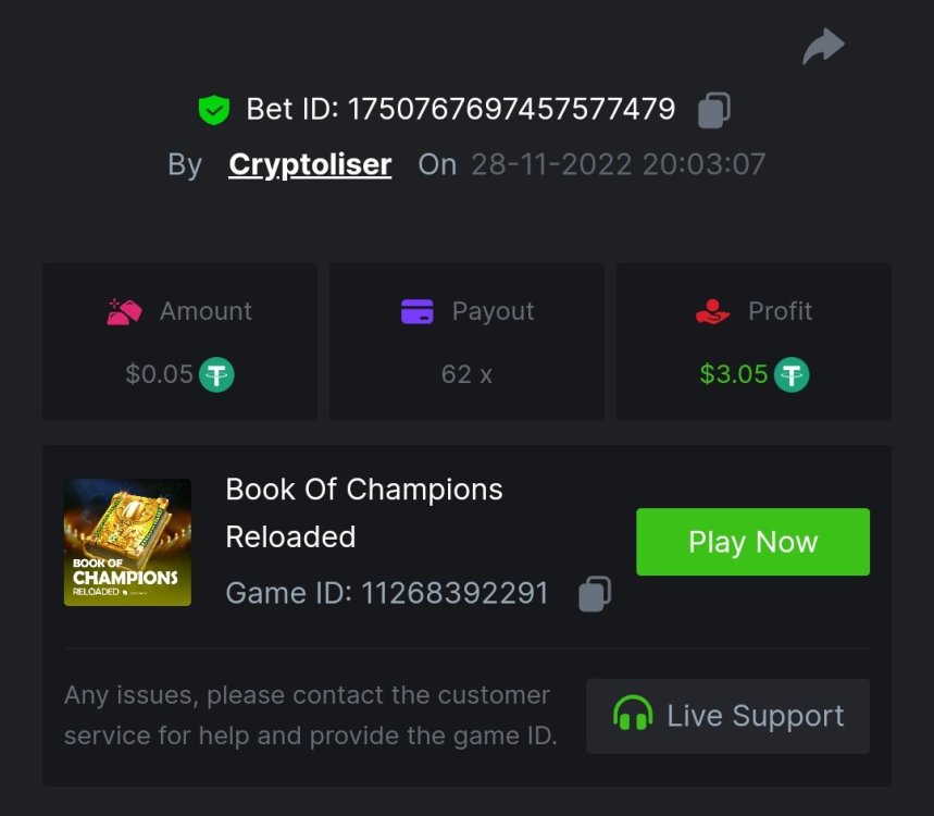 Book of Champions Reloaded - $0.05 https://bc.game/#/sd/10Y5G0EHHYTE6R Book of Champions - $0.1 https://bc.game/#/sd/10Y5JPRE4HI2OJ Lucky score - $0.1 https://bc.game/#/sd/10Y5H83QB80O43 Book of Champions - World Glory - $0.1 https://bc.game/#/sd/10Y5J5DE2DPIC3 -